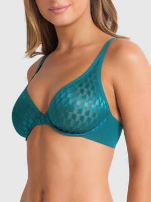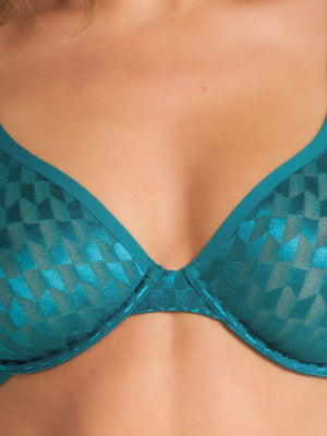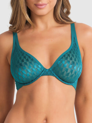 Make a bold statement with the Graphic Underwire Plunge Bra in Pacific Green. Made from a sleek geometric mesh fabric, this bra features a flattering deep V neckline and underwire support for lift and shape. The moulded, double-lined cups provide natural shaping and a smooth, comfortable fit while the adjustable shoulder straps ensure the perfect fit every time.