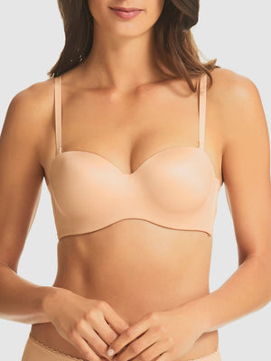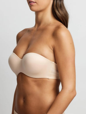 Our best-selling nude coloured strapless bra!The Memory Strapless Bra in Skin offers a smooth, seamless solution for everyday wear. Light, non-crease memory foam cups are designed to mould to the shape of your bust, creating the perfect fit. A convertible bra that adjusts 4 ways: strapless, halter, regular and crisscross.