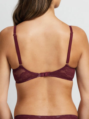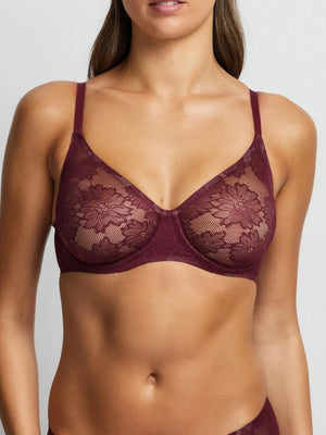 Plunge your way. Make the ultimate statement in our Weightless Underwire Lace Bra in Fig. Feminine yet sexy, this bra is cut from ultra comfortable stretch lace, offering the freedom of a bralette with the support of an underwire bra. The all-over floral lace design and deep v plunge neckline make it the perfect addition to your bra wardrobe.